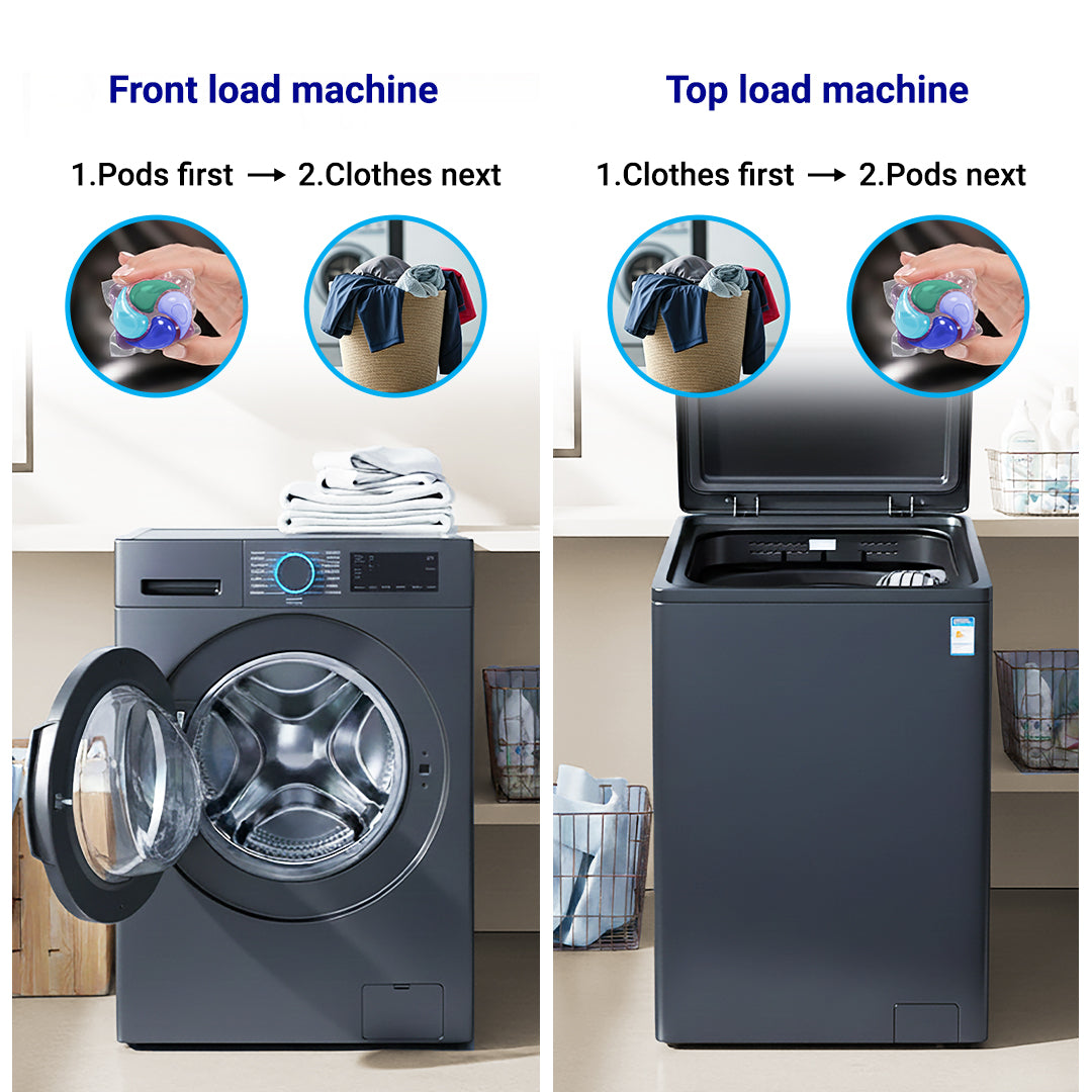 Handle with dry hands, do not tamper or cut the pods, avoid the detergent dispenser drawer, use the pods along with the clothes.
